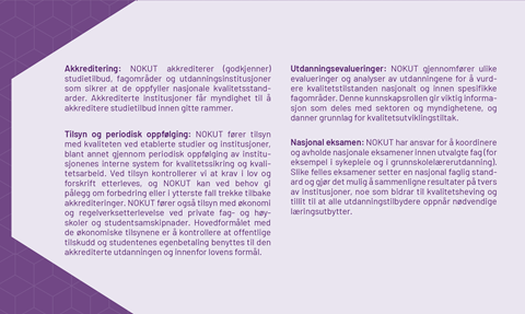 | NOKUT forvalter relevant regelverk og utøver myndighet ved å akkreditere nye studietilbud og institusjoner samt føre tilsyn med kvaliteten i norsk høyere utdanning og fagskoleutdanning. | NOKUT innhenter, analyserer og formidler kunnskap om tilstanden til utdanningskvaliteten i høyere utdanning og fagskolesektoren. Gjennom blant annet undersøkelser og evalueringer gir organet et grunnlag om kvalitet som kan brukes av sektoren og samfunnet. | NOKUT er en pådriver for kvalitetsutvikling i utdanning. Denne rollen innebærer å bruke kunnskapen som frembringes til å identifisere kvalitetsutfordringer, løfte frem gode praksiser og sette viktige temaer på dagsorden samt gi fagpolitiske råd til myndigheter og sektoren. |